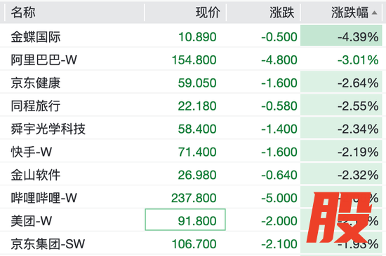 科技股集体下挫,阿里巴巴跌超3%,京东健康、快手、哔哩哔哩、美团跌超2%,百度集团、腾讯控股跌近1%。
